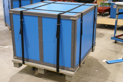 重梱包では、50kgや100kg以上の荷物をそのままフォークリフトで運び、船などに積み込みます。そのため、オリウスには、パレットまたはキャスター台車を取り付けることができるようになっており、箱の内部にはクッション材(緩衝材)を入れ、製品を固定することができます。