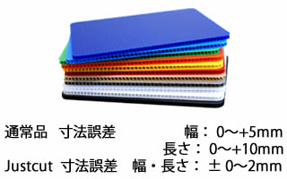 通常品は幅:0〜+5mm、長さ:0〜+10mmの寸法誤差がありますが、ジャストカット品は寸法誤差が±2mmとなります。