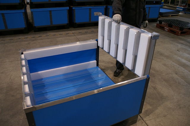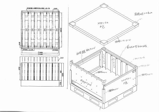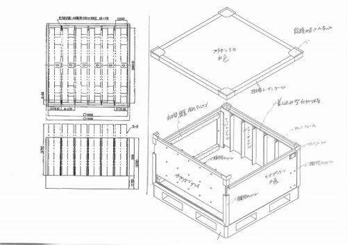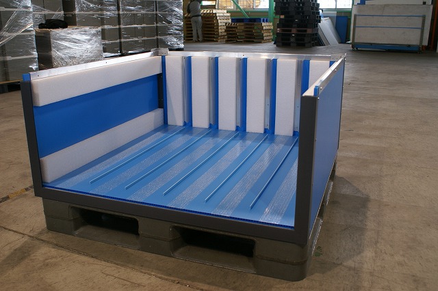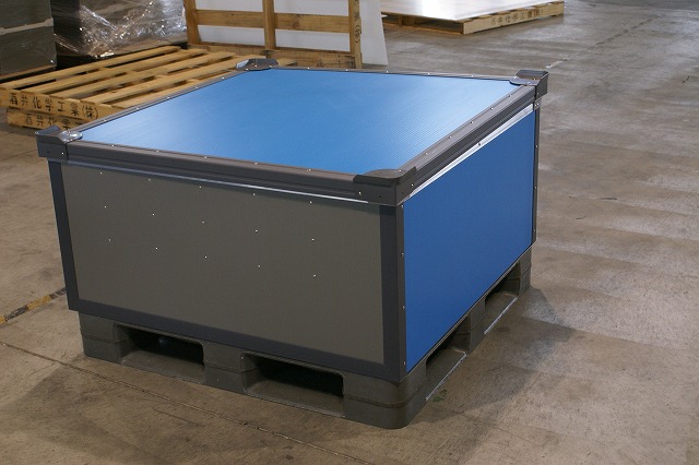 パレットは1100x1100x高さ150mmの四方差し・ハンドリフト対応の樹脂パレットを使用しています。
