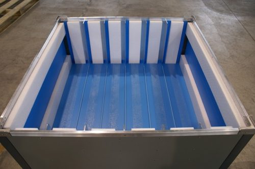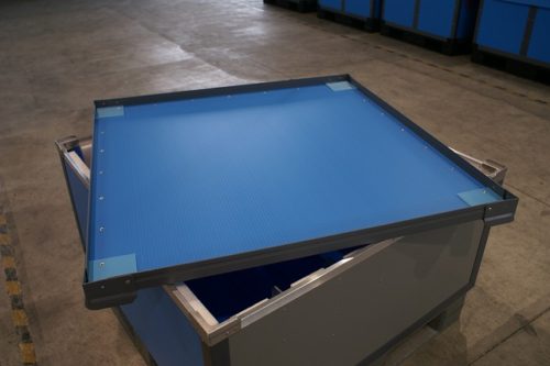 フタの表側にはリブつきコーナーキャップをとりつけて、保管時には重ねることもできるようにしました。