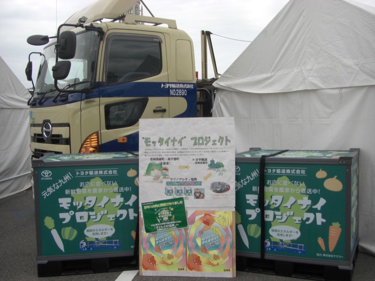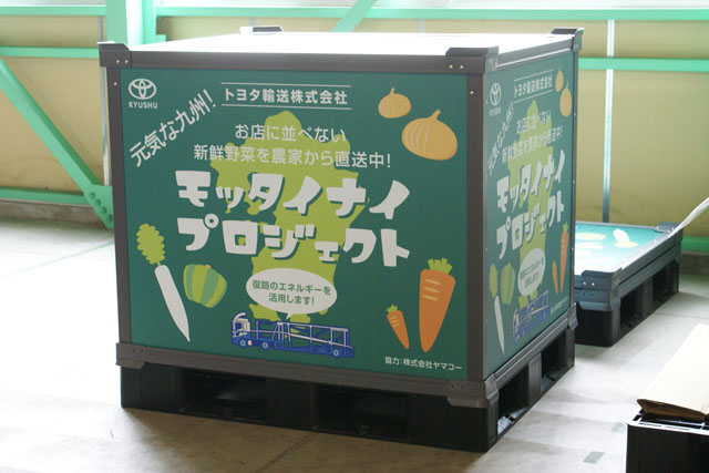 • トヨタ自動車九州株式会社様とトヨタ輸送株式会社様は帰り便トラックを役立てることができないかと考えていました。そこでB級農産物の搬送を企画しました。消費者に届かなかったB級農産物を帰りのトラックで搬送して車も野菜もどちらも有効利用しようという試みです。この企画は「モッタイナイプロジェクト」と名付けられてスタートしました。