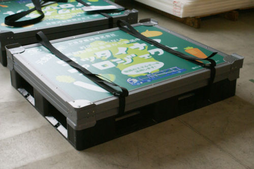 • モッタイナイプロジェクトの野菜運搬に使用されたのがこのオリウスです。中にB級野菜が入ります。全5面に印刷を施してあるため、目的や中身が一目でわかります。