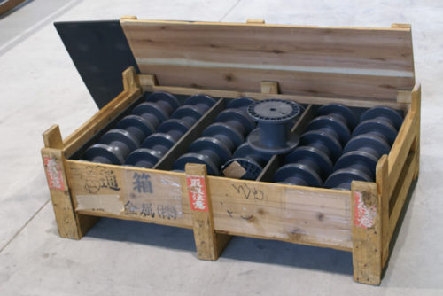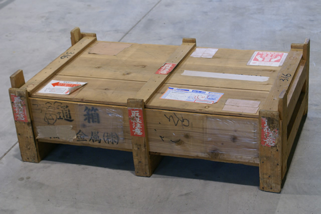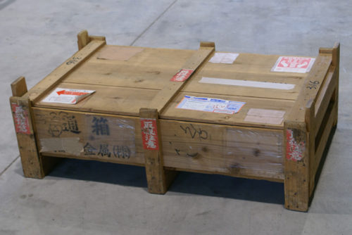 現状は木箱をつかって保管や搬入をしています。中身は超極細の金属銅線を巻き取ったリール(一巻き5Kg)を30巻入れています。