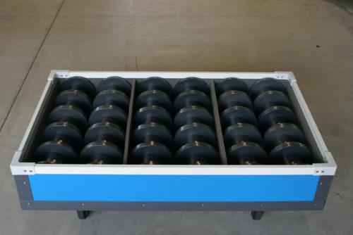 • 厚み10mmのプラダン(水色)と樹脂フレーム(グレイ色)で30巻入りピッタリのコンテナを製作。