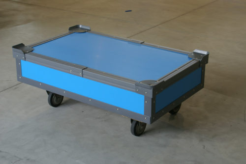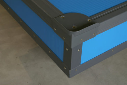 • かぶせのフタをしたところです。ふたの四つ角には荷崩れ防止用コーナー(立ち上がり20mm)をとりつけました。段積みがより安定するように、長辺中央に受け板を取りつけてあります。