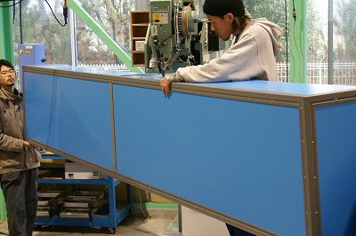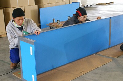 また通常、コンテナ用の樹脂及びアルミフレームはMax4メートルまでですが、当社のパーツ製造工場の協力により4.5メートル1本ものフレームを用意して製作しました。箱底の角はジュラルミンケース用のコーナーアテで補強しました。