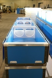 コンテナ1箱には2本入れて、通いで使います。内部には管を固定保持するクッション材を設置しますので、箱の大きさは全長4400x巾700x高さ600mmにもなります。箱本体は厚み10mmのプラダンで組んでありますが、プラダン原反の大きさがMax2.4Mなので中央部でつないでいます。