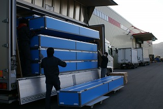 積み込み作業中です。4トントラックに積載15ケース(3列x1行x5段)です。
